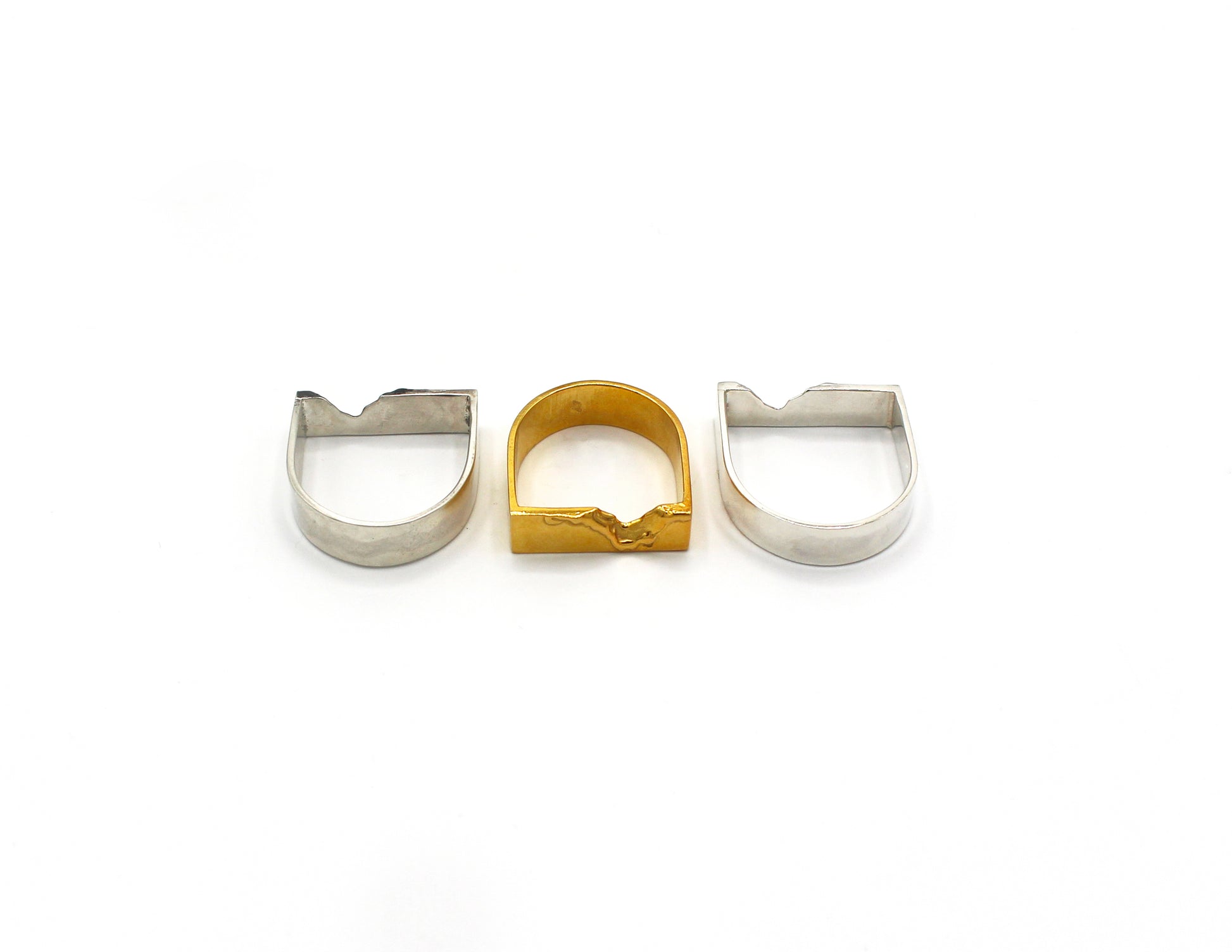 Collection Fall: Inspirée par le mouvement, la collection explore les courbes et les contraintes qu'exerce les vents sur la nature . La matière brute et figée du métal contraste avec la légèreté de l’air. Modelées à la main dans de fines plaques de cire, chaque pièce est ensuite retravaillée en métal afin d’obtenir l’interprétation la plus fidèle d’un mouvement envoûtant et organique.