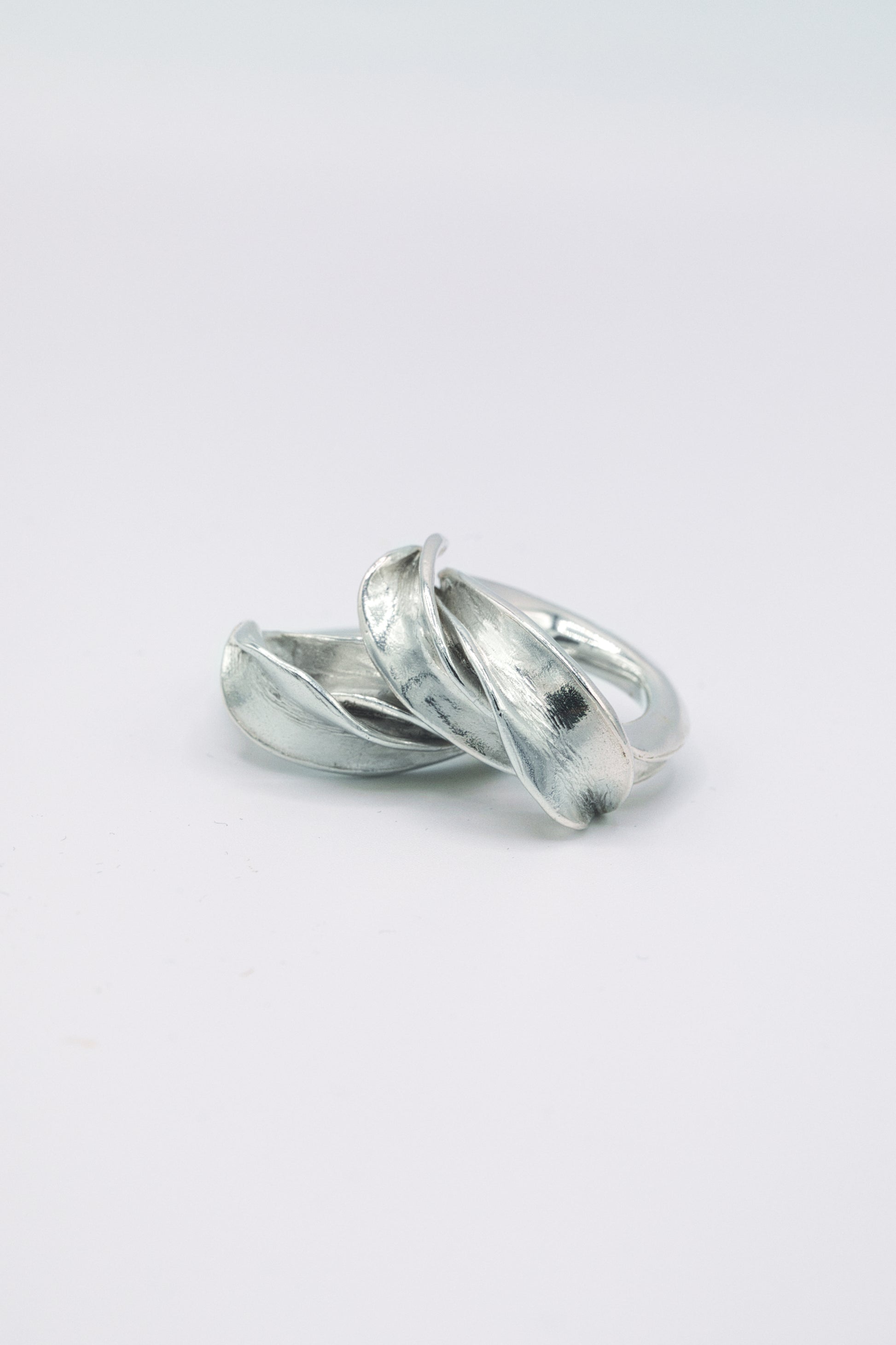 Collection Fall: Inspirée par le mouvement, la collection explore les courbes et les contraintes qu'exerce les vents sur la nature . La matière brute et figée du métal contraste avec la légèreté de l’air. Modelées à la main dans de fines plaques de cire, chaque pièce est ensuite retravaillée en métal afin d’obtenir l’interprétation la plus fidèle d’un mouvement envoûtant et organique.